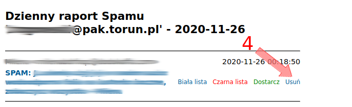 Wybierz Biała lista (3) jeżeli nadawca wiadomości jest Tobie znany i masz pewność(!), że wiadomość nie jest SPAMEM. Adres nadawcy zostanie dodany do białej listy i następne wiadomości będą dostarczane.